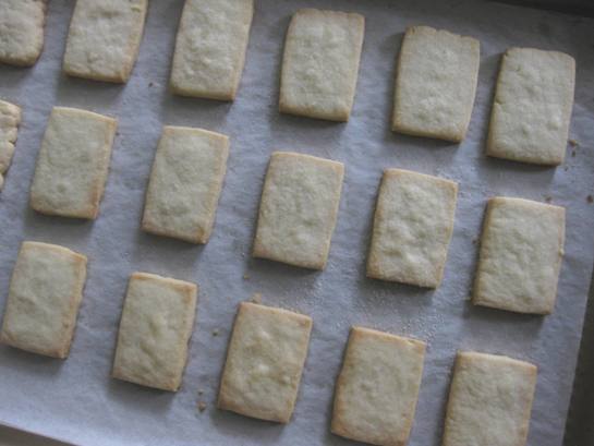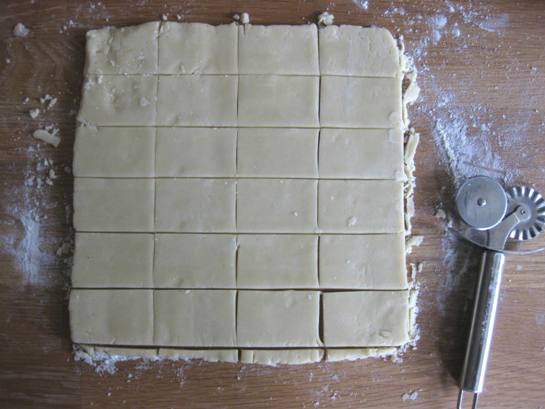 The suggested method for cutting into rectangle portions is by scoring the dough with a knife, letting it chill again if needed and then cutting all the way through. My dough was still cold so I simply marked at the appropriate lengths and then cut with the straight edge of a pie wheel. Any crumbs on the edges were pressed into the sides of the pieces. I figured there is enough butter that it would meld together in the oven. Then I lifted them onto my parchment-lined baking sheet.