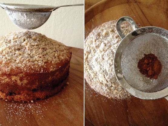 The dusting on top is a combination of powdered sugar and a cocoa cinnamon mixture. I like the layering of colors beginning with the white from the powdered sugar and finished with the brown, which pops with the white beneath.