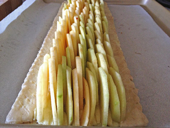 The fanning technique was different than what I have done previously in that the slices are propped upright on the pastry cream filling. It was by far my favorite step in preparing the recipe. Each slice is placed standing up, overlapping a third and lined up length-wise across the tart. Then I continued to add more rows of apples till the whole tart was filled. I used four medium-sized apples- Granny Smith and Pink Lady.