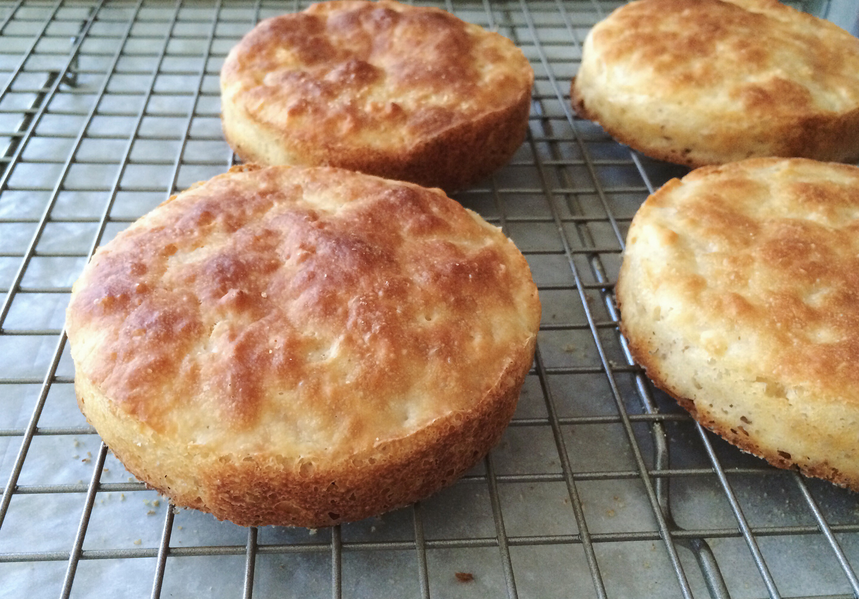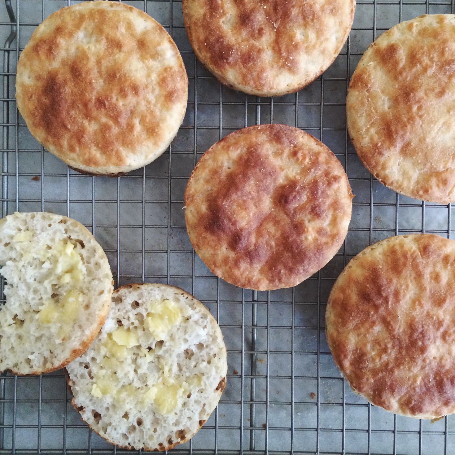 The muffins get nice and golden all around. One other difference I noticed between these and griddled versions is the shape. These muffins are disc-like because they bake in rings the whole time, whereas the griddled ones are more rounded and pillow-like because they’re baked partially in the rings or free-form (Model Bakery muffins).